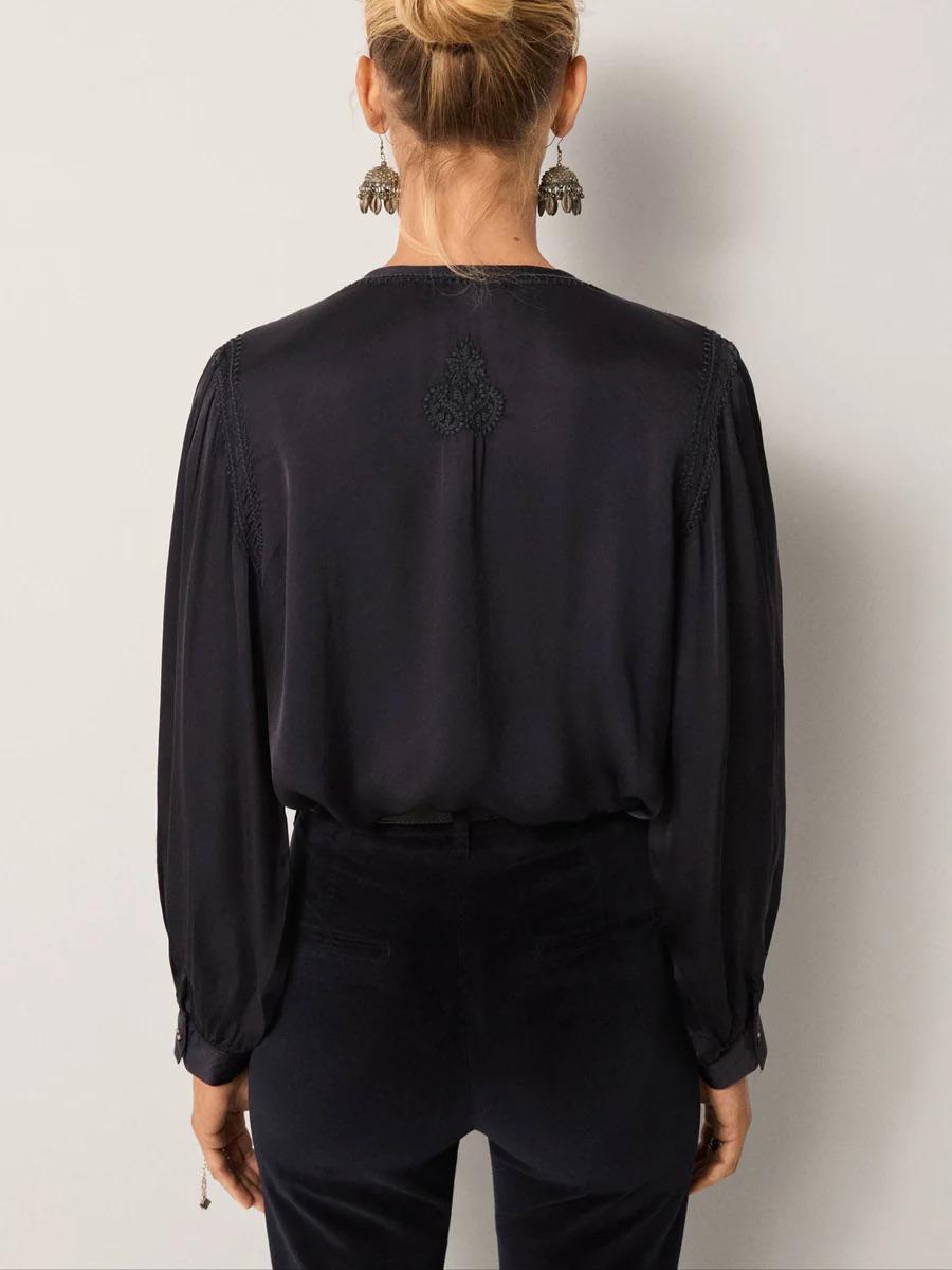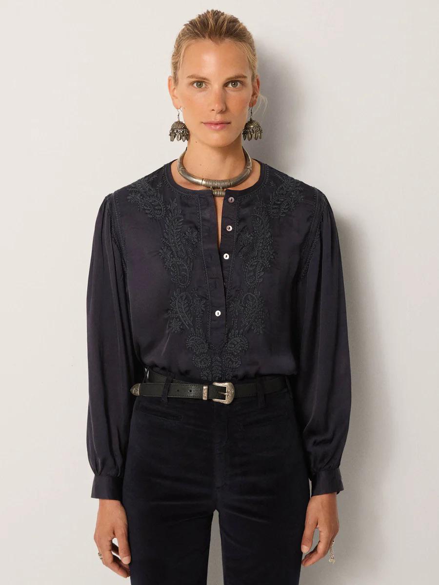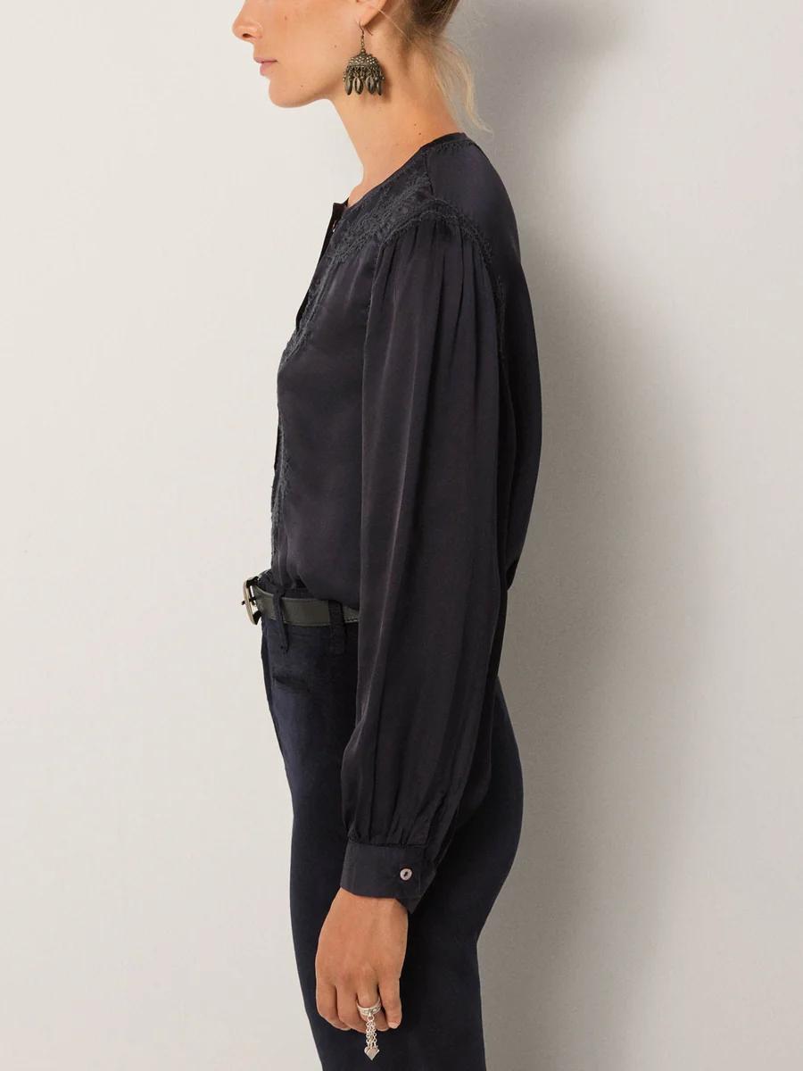 Jeff boutique propone blusa “CLOTILDE” MAISON HOTEL modello dritto con spacchetti in raso di viscosa. Completamente ricamata sul davanti con motivi in rilievo. La tonalità è inchiostro blu navy.